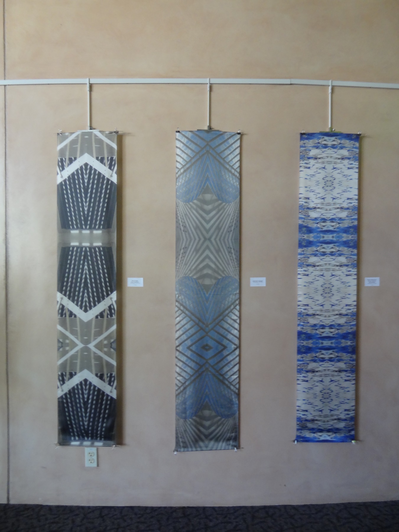 My architectural photographic designs on silk charmeuse are 14″ x 72″ can be hung on the wall as art and are also wearable as scarves.